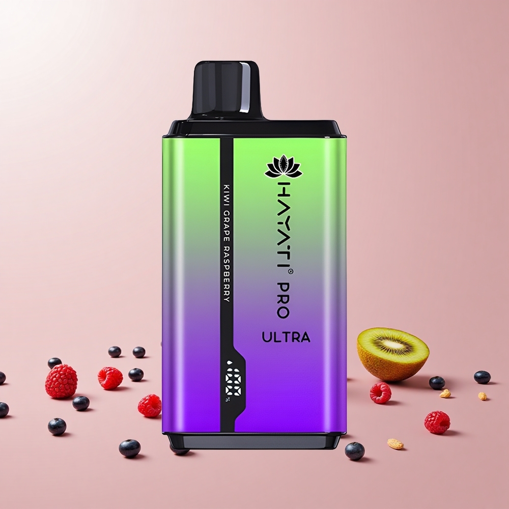 Hayati Pro Ultra 15000 Puffs Disposable Vape Kiwi Drue Hindbær Features: Pust: 15000+ Batteri: 850mAh E-Liquid Kapacitet: 2 12ml Nicotin Styrke: 2% Smagsvarianter: 49