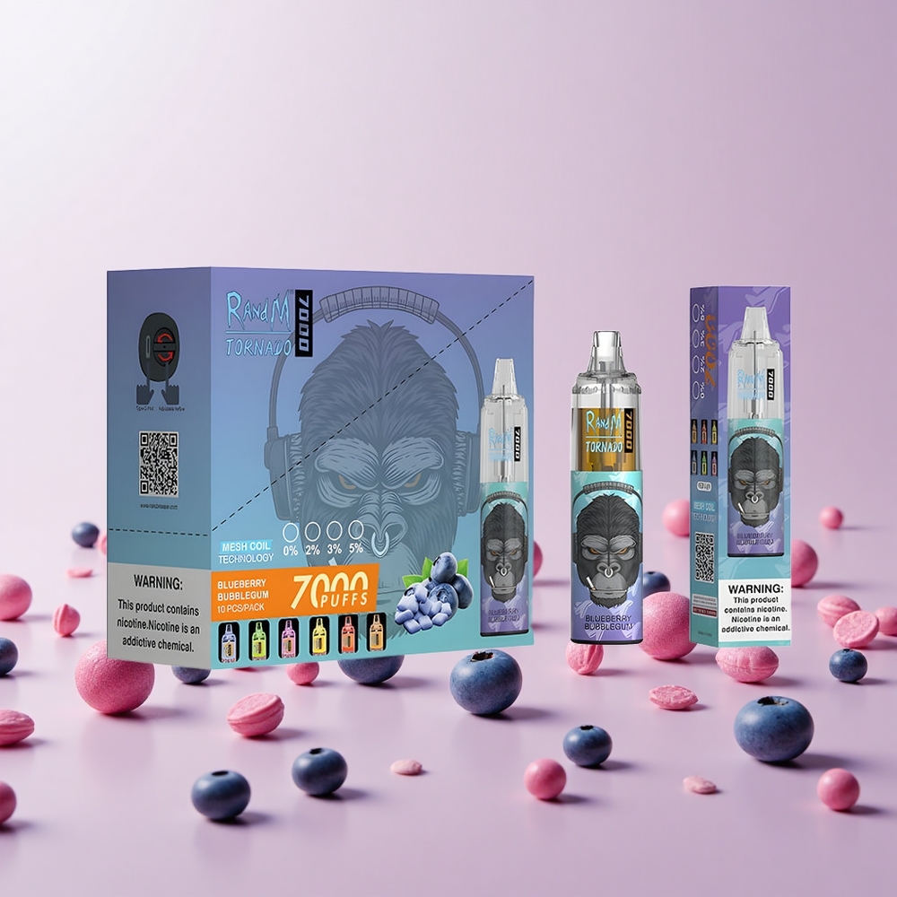 RandM Fumot Tornado 7000 Puffs Engangs Vape Blåbær Tyggegummi med 14 ML E-væske og 850 MAH Batteri