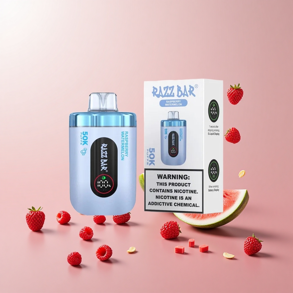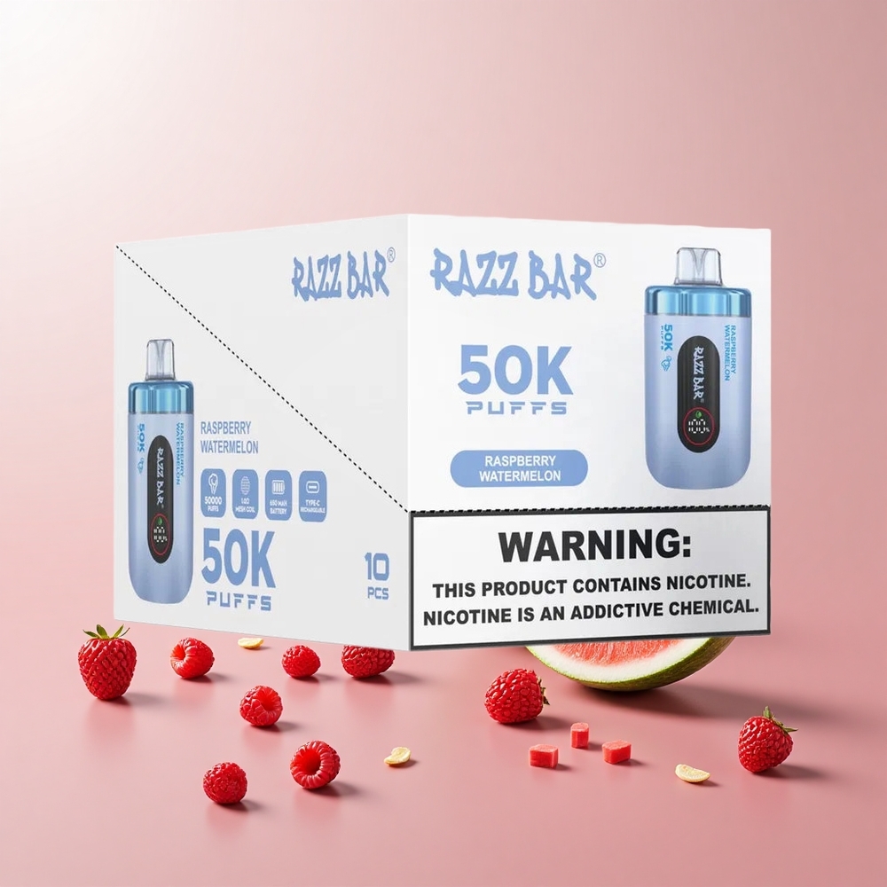 Razz Bar 50K Puffs Engangs Vape Hindbær Vandmelon Features: Op til 50000 Puffs 1.0 Ohm Mesh Coil 650 Mah Batteri Type-C Genopladelig 2% Nikotinindhold