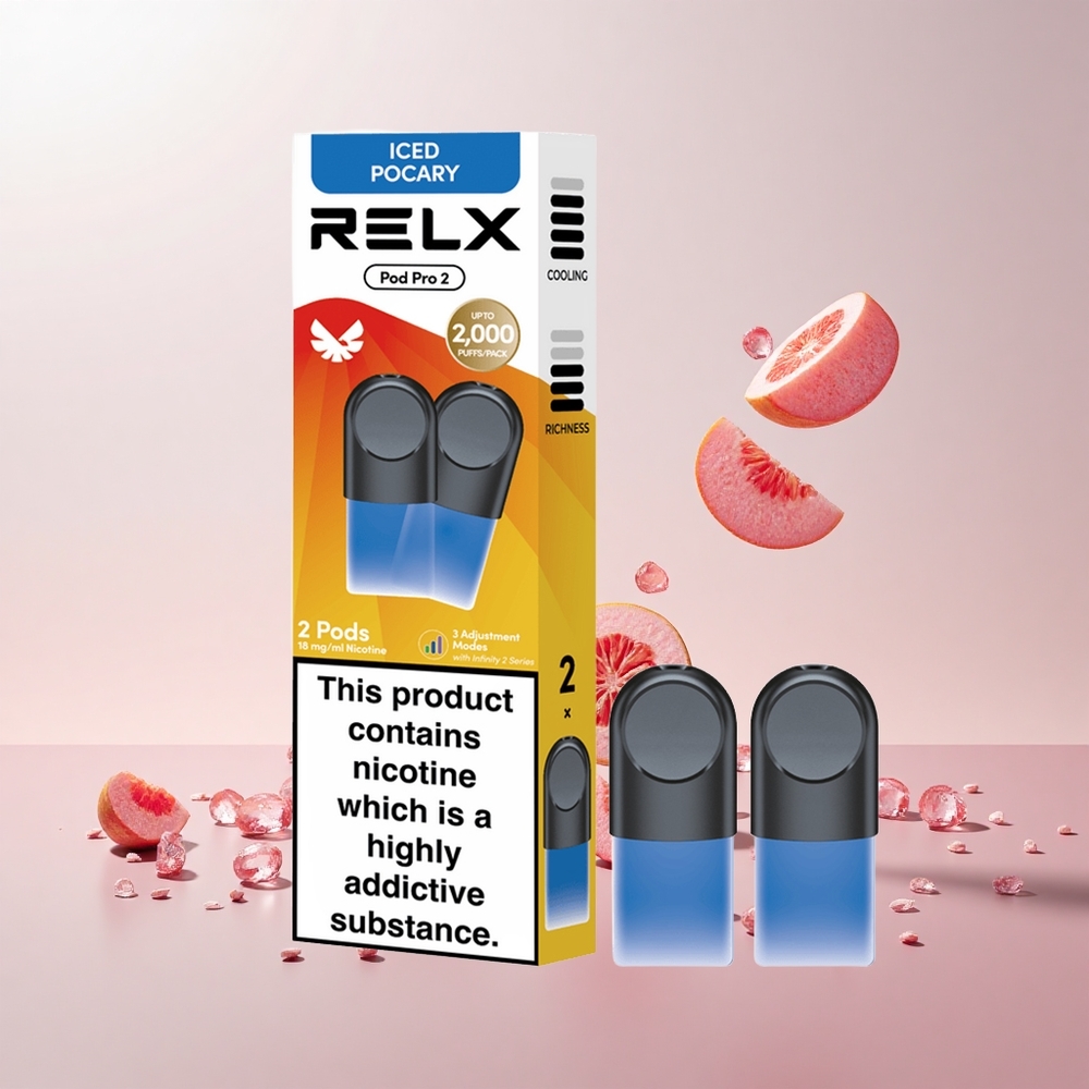 RELX Pod Pro 2 Vape Device Drikkevare-Iskold Pocary og RELX Pod Pro 2 1,8% Nicotinindhold 600 Pust
