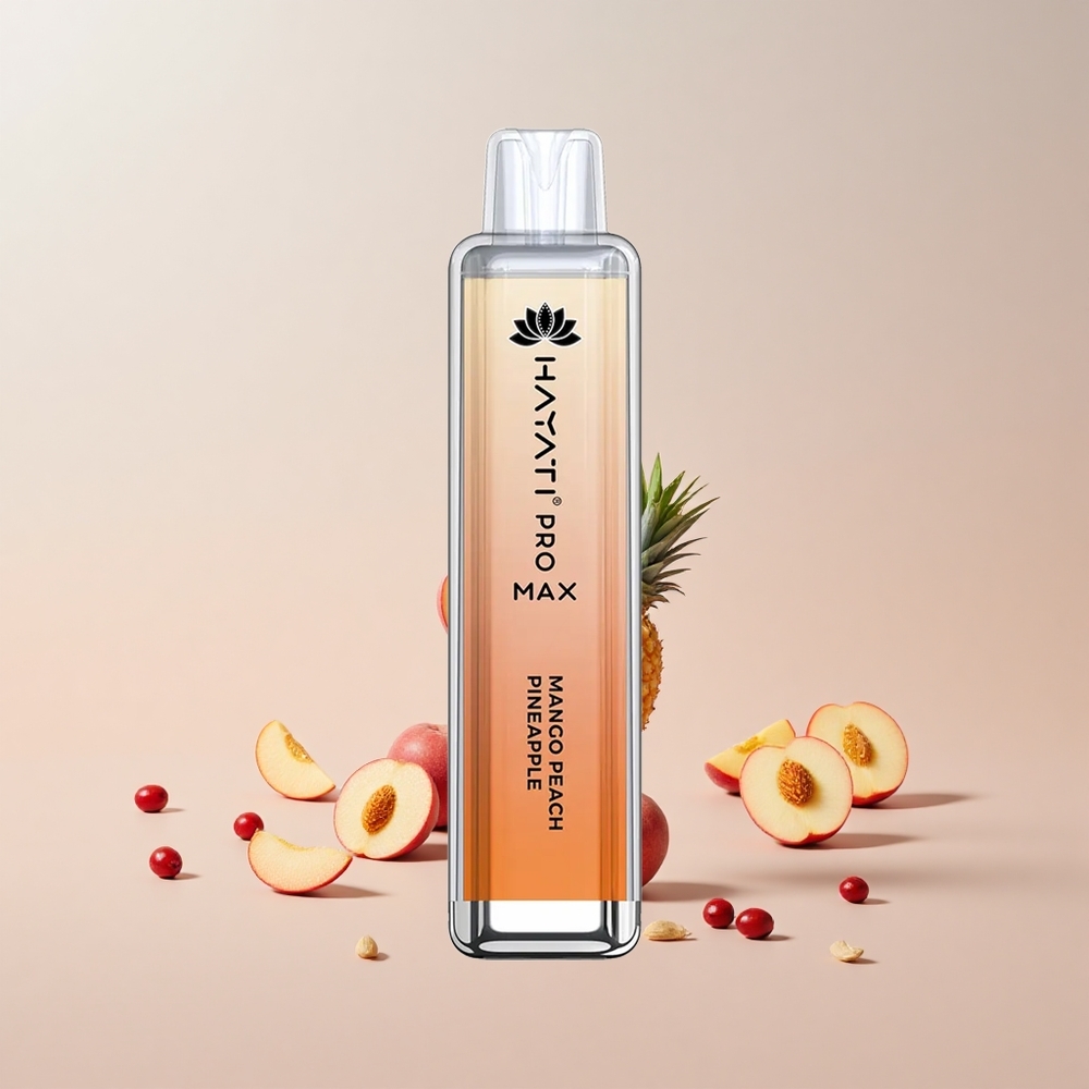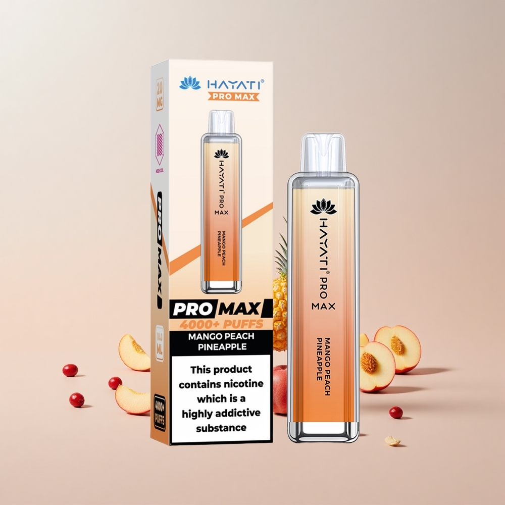 Hayati Pro Max 4000 Puffs Engangs Vape Mango Fersken Ananas Funktioner: 28x8x20mm 2%, 5% Nikotinstyrke Indåbningsaktiveret Dobbelt 1,1 Ohm Mesh Spole 1400mAh batteri 2ml tank med 10ml automatisk påfyldning