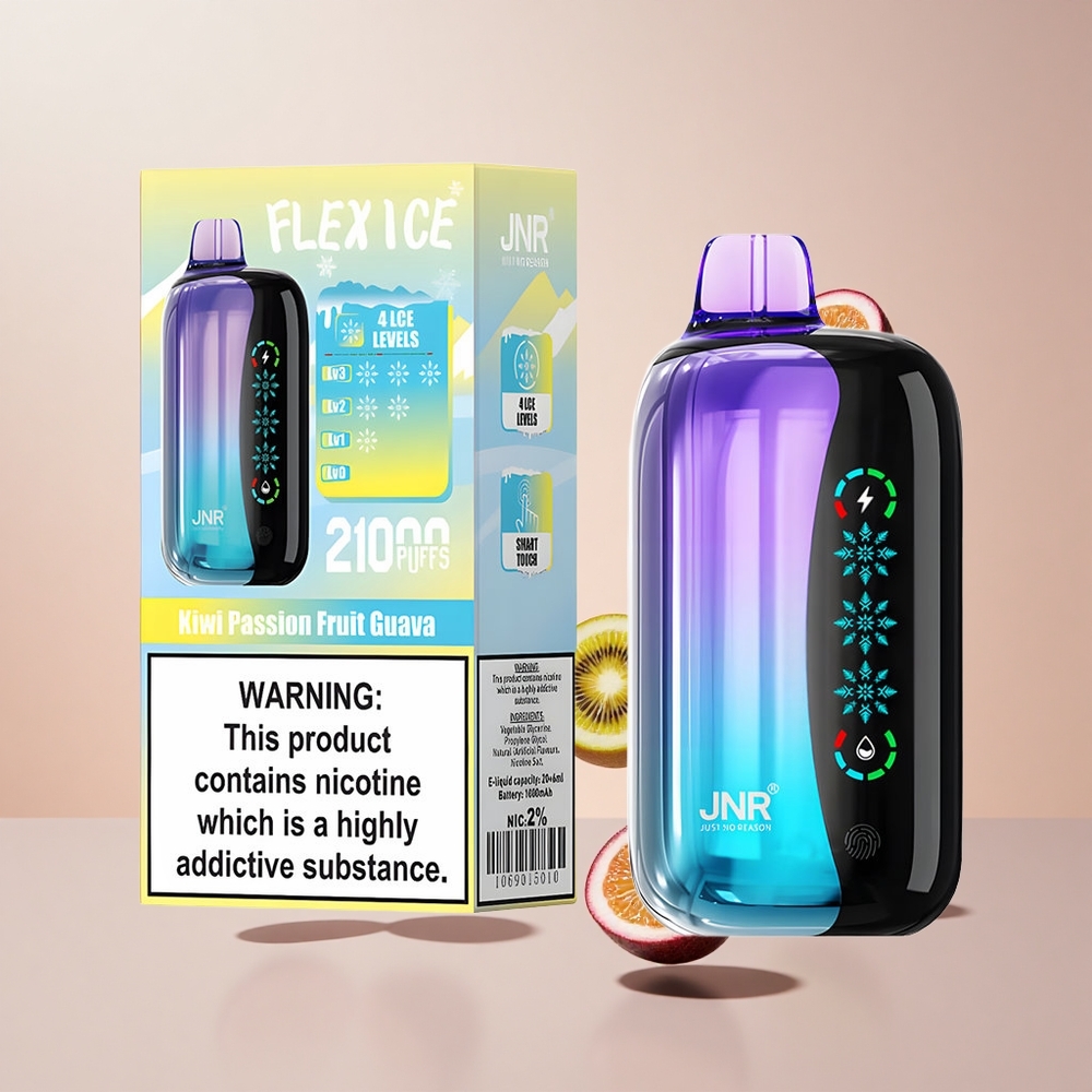 JNR Flex Ice 21000 Puffs Engangs Vape Kiwi Passionsfrugt Guava JNR Flex Ice 21000 Puffs Engangs Vape Tilpasbar Is Ca. 21000 Puffs 26ml E-væske Tilpasselig Luftflow Touch Screen 1.2 Ohm Dual Mesh 1000mAh Batterikapacitet Type-C Opladningsport Nicotinindhold 0%,2%,3%,5%.