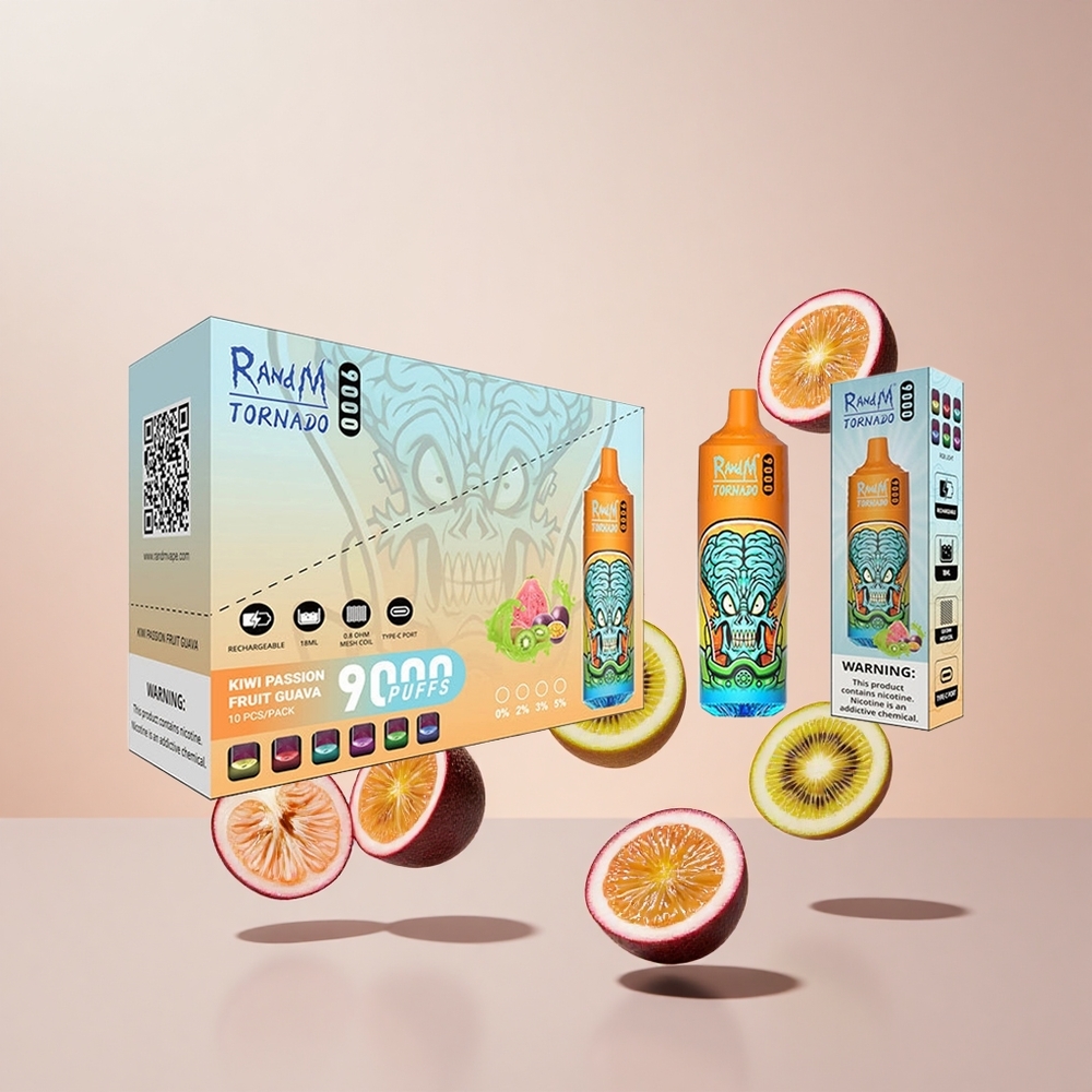 RandM Fumot Tornado 9000 Puffs Engangs Vape Kiwi Passionsfrugt Guava RandM Tornado 9000 Puffs Pust: 9000 Pust Batterikapacitet: 850 mAh Genopladelig E-væskekapacitet: 18 mL Coil Type: Mesh Coil Display Type: Sleek RGB Display Smagsvarianter: 54 Sortiment