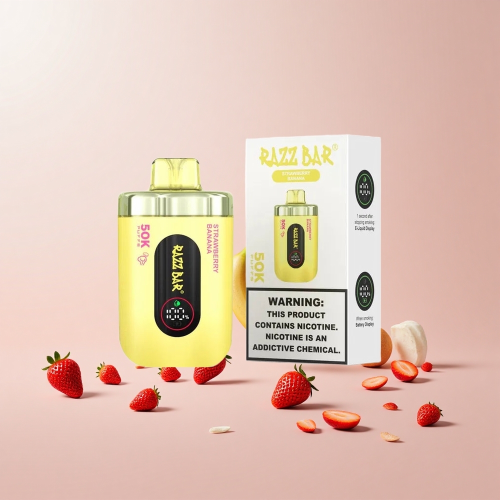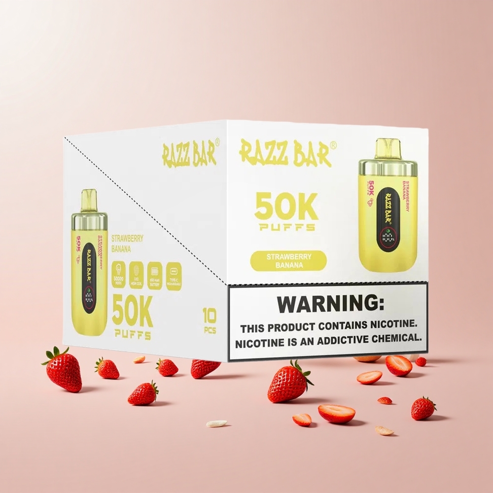 Razz Bar 50K Puffs Engangs Vape Jordbær Banan Features: Op til 50000 puff 1,0 Ohm Mesh Coil